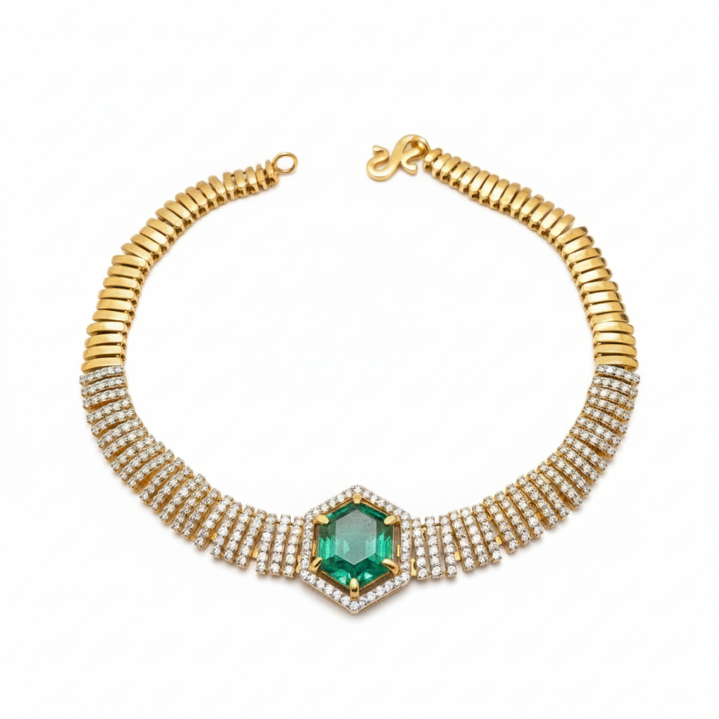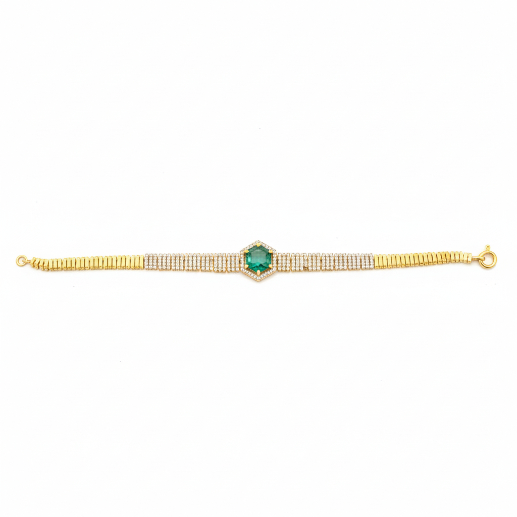 An elegant gold bracelet featuring a beautifully crafted green-toned centerpiece framed with intricate gold detailing. The flexible, textured gold links add a rich shine and comfortable fit, making it perfect for festive occasions and refined everyday elegance.