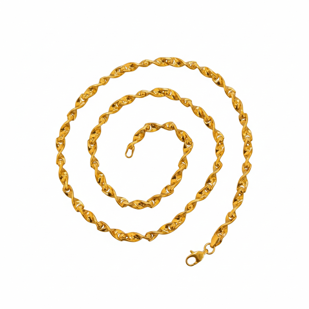 A classic men’s gold chain crafted with elegant twisted links that create a strong yet refined look. Its smooth finish and balanced weight make it perfect for daily wear or special occasions—timeless, masculine, and effortlessly stylish.