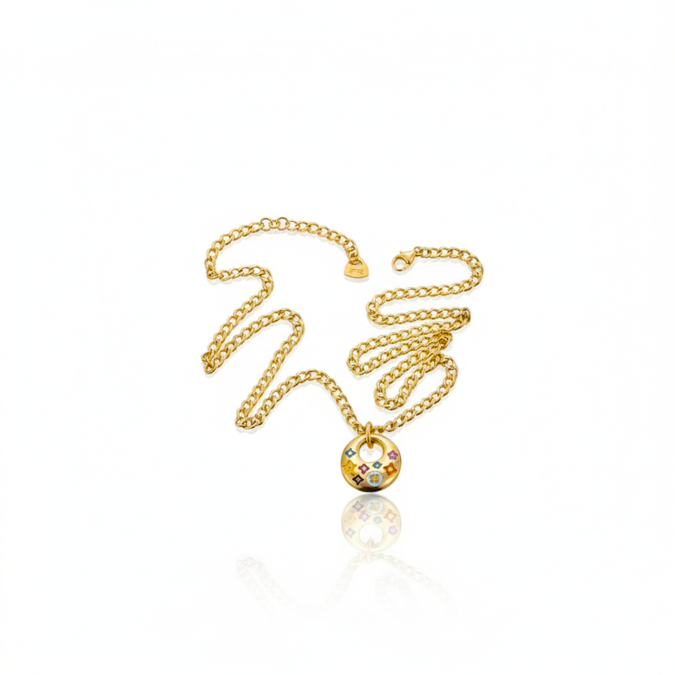 An elegant 18K gold chain featuring a circular charm adorned with colorful stars and floral motifs. The vibrant detailing adds a playful yet classy touch, making it perfect for everyday wear or festive styling. A radiant blend of charm and modern grace.