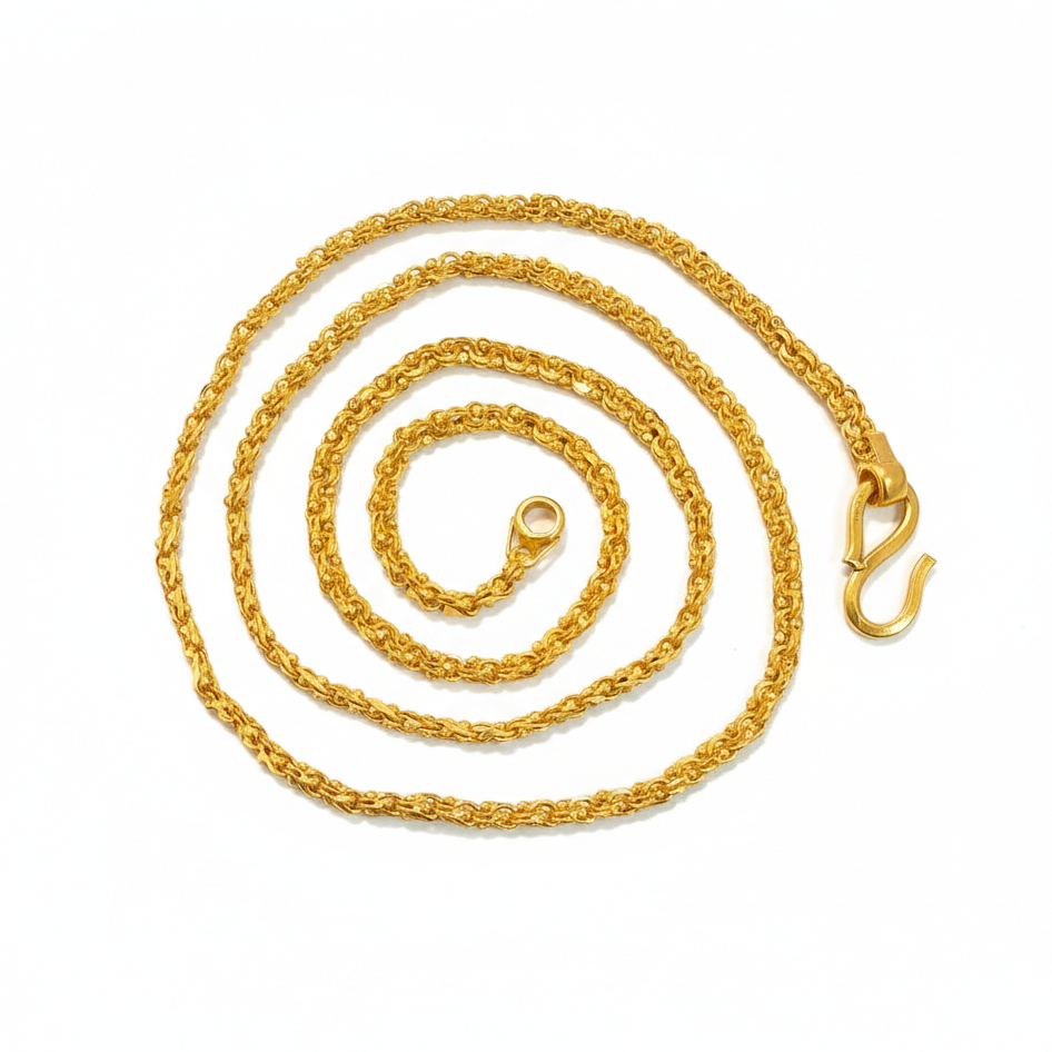 Crafted in gleaming gold, this chain features a tightly woven knot-style design that offers strength and rich shine. Its bold yet elegant look makes it perfect for daily wear or special occasions.