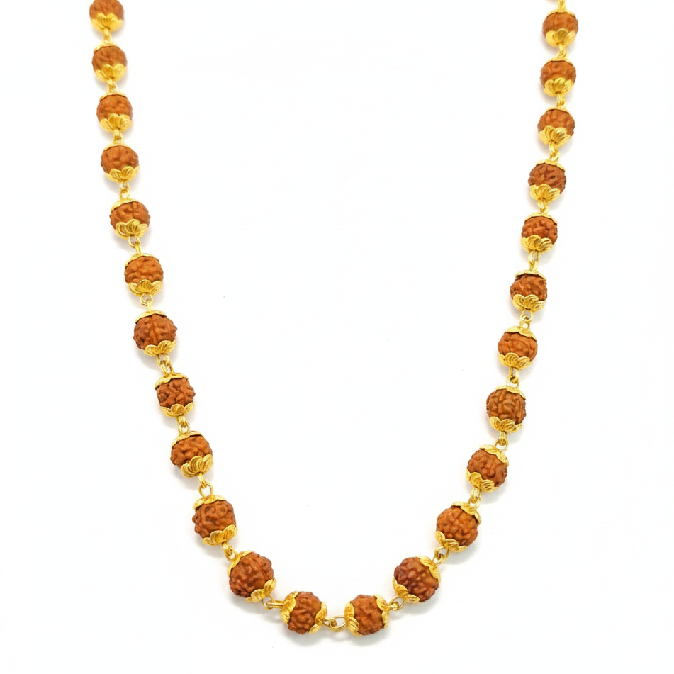 A divine gold chain adorned with natural Rudraksha beads and finely crafted gold spacers. Blending spiritual significance with elegant design, it’s perfect for daily wear, meditation, or as a meaningful traditional accessory with timeless appeal.