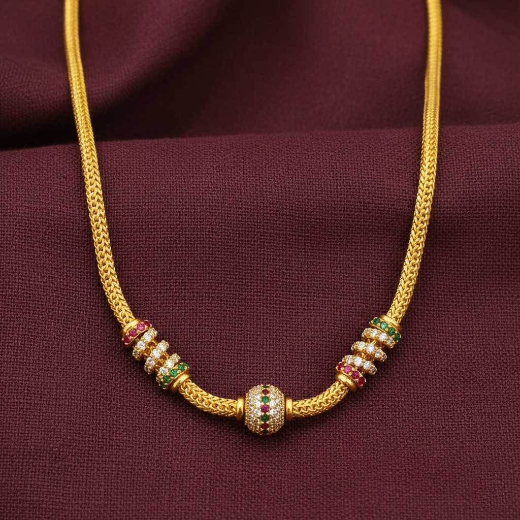 A luxurious gold chain featuring a textured central bead and colourful stone-studded spacers. Rich in detail yet elegant in form, it adds a vibrant, regal touch—perfect for festive occasions, celebrations, and statement ethnic styling.