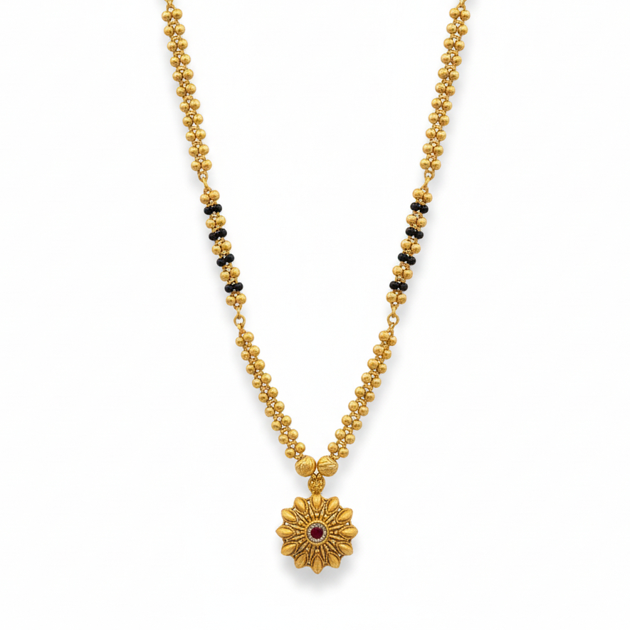 A beautifully crafted mangalsutra featuring a delicate gold-toned beaded chain with black bead accents and a radiant floral pendant with a subtle stone center. A perfect blend of tradition and charm, ideal for daily wear or festive moments.