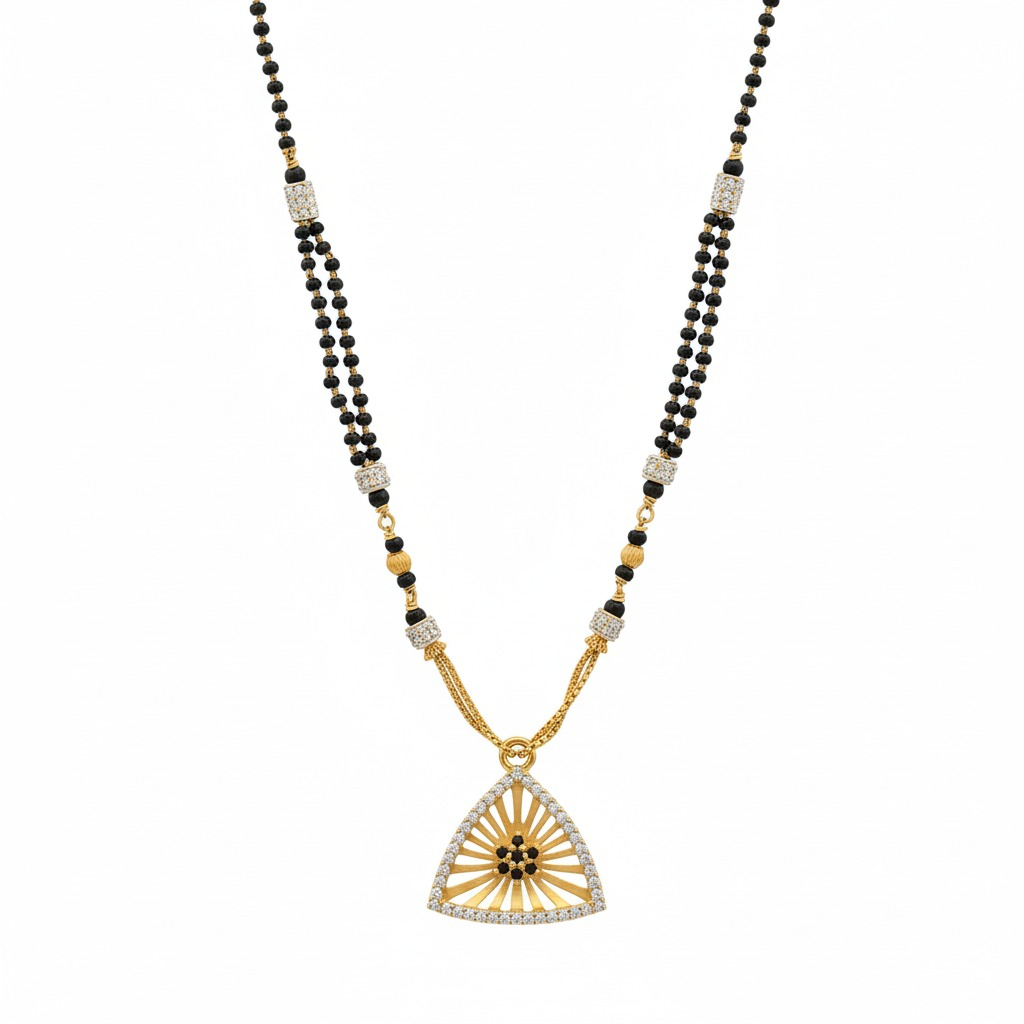 A graceful mangalsutra featuring a unique fan-shaped pendant inspired by radiant sun rays, highlighted with delicate black bead detailing. Paired with a classic double-line black bead chain, this design blends modern charm with traditional elegance.