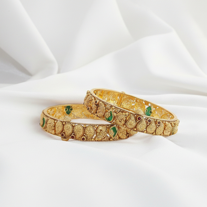 Opulent gold-tone kada bangles featuring intricate paisley and floral motifs with rich green and crimson-hued accents. Inspired by royal heritage craftsmanship, these bangles add timeless grandeur and festive elegance to traditional ensembles.