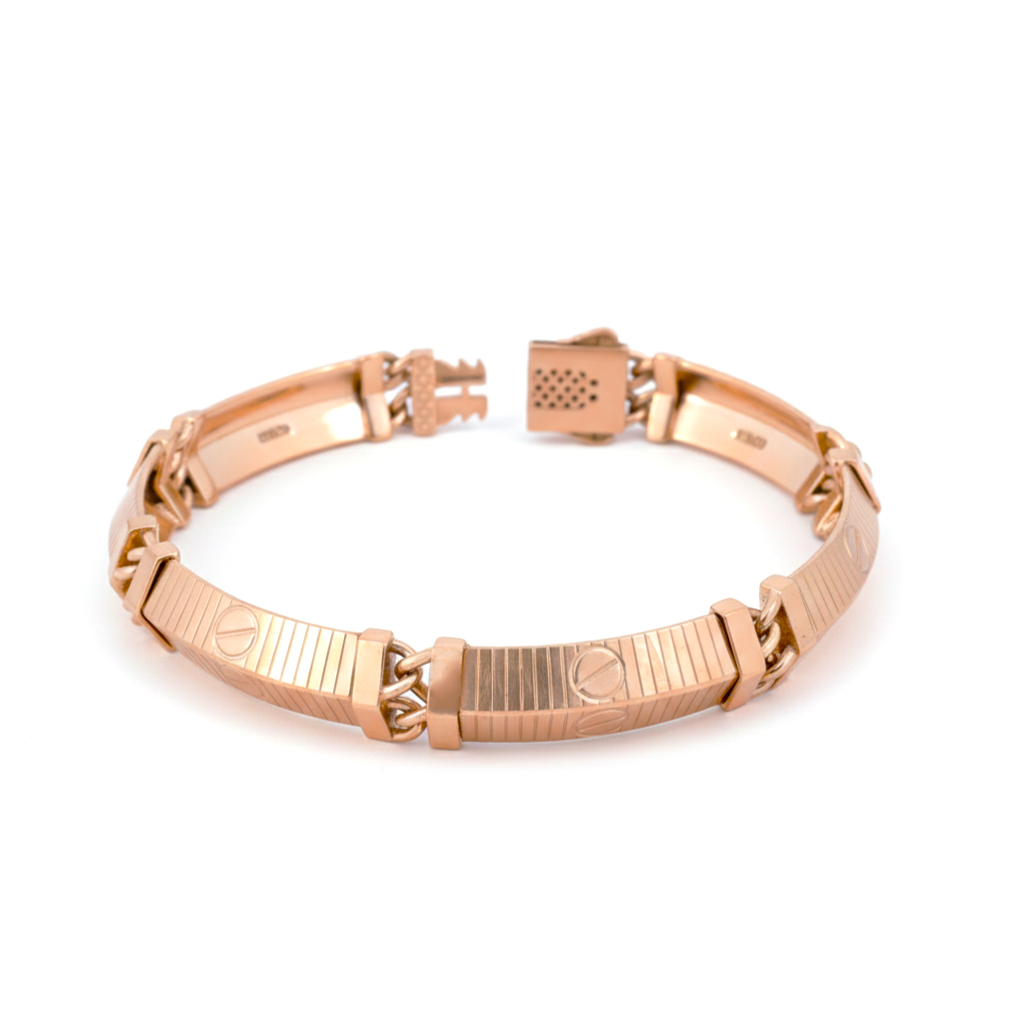 Crafted in 18K gold, this elegant bracelet features sleek textured links with a refined geometric finish. The secure clasp ensures comfort and style, making it perfect for daily wear or special occasions. A timeless piece that adds subtle sophistication to every look.