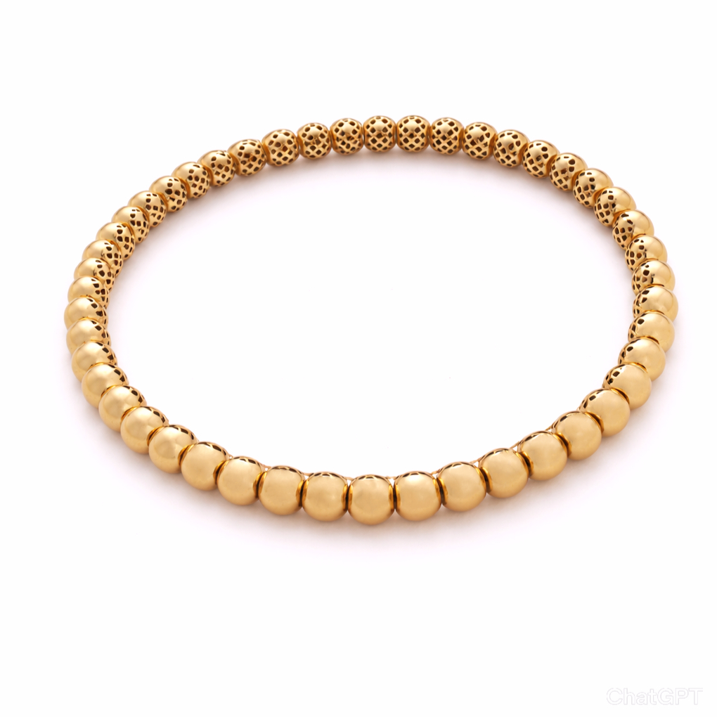 A sleek 18K gold bracelet crafted with polished spherical beads, blending shine and subtle texture. Its minimalist circular design offers effortless elegance, perfect for daily wear or special occasions. Lightweight, timeless, and versatile – a refined statement of grace.