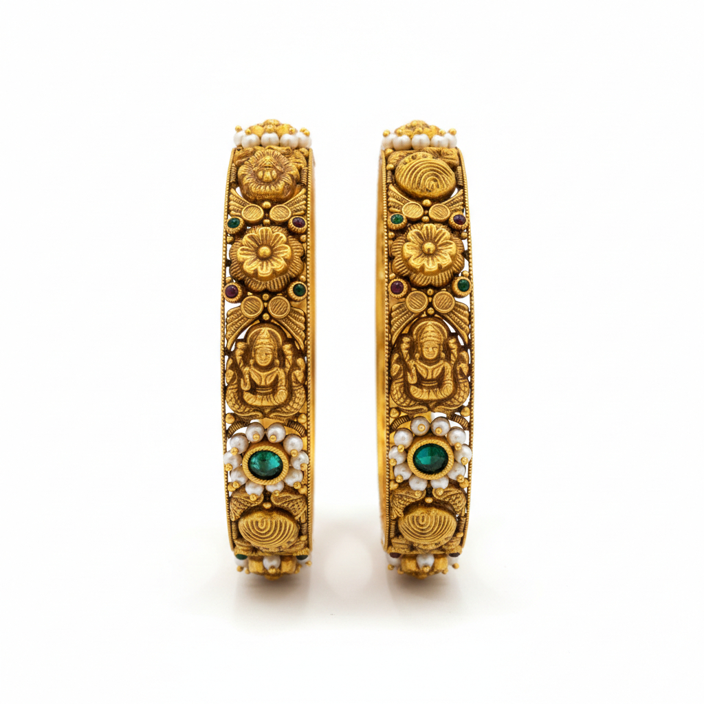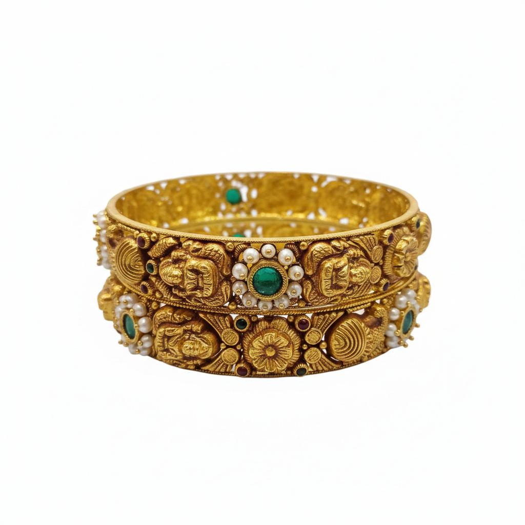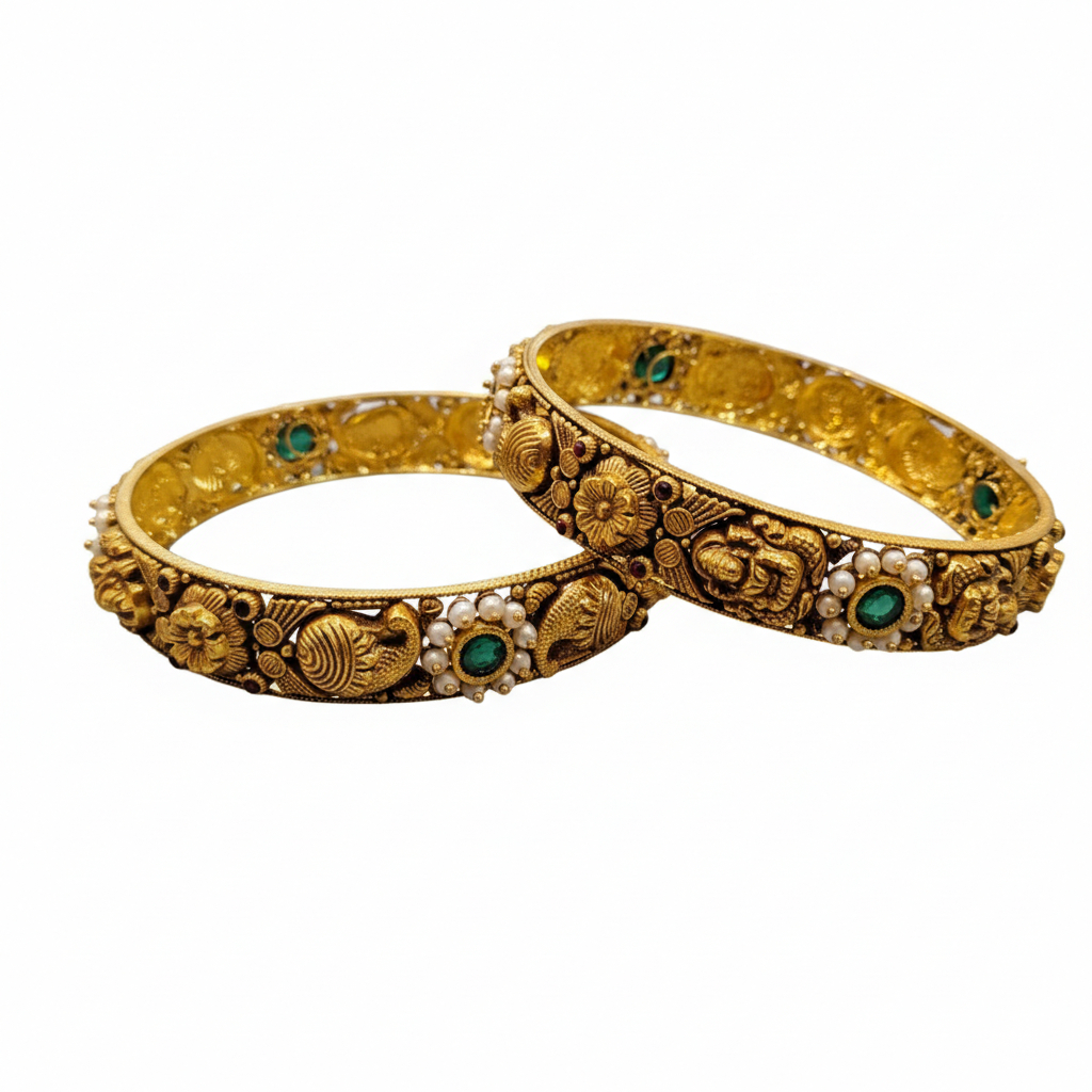 Exquisite 22K (916) gold bangles featuring intricate Nakshi peacock carvings, vibrant green stones, and pearls. A timeless pair of antique-finish ethnic jewelry for grand occasions.