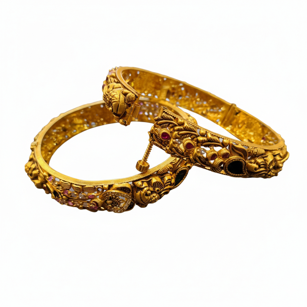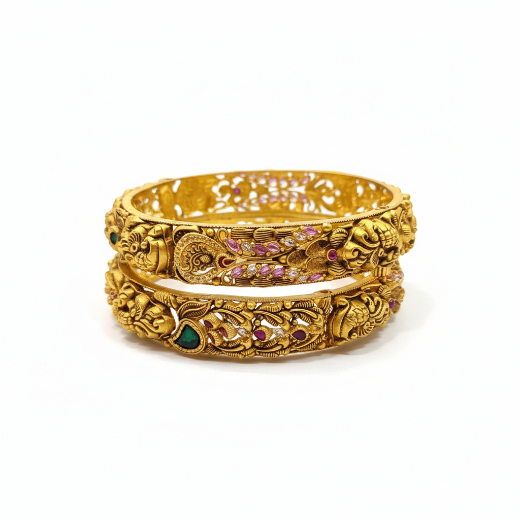 Inspired by royal temple artistry, these intricately carved gold bangles feature majestic peacock motifs adorned with delicate pink and white stones. The bangles reflect timeless tradition and grandeur. Perfect for weddings and festive occasions, they radiate regal elegance and cultural charm