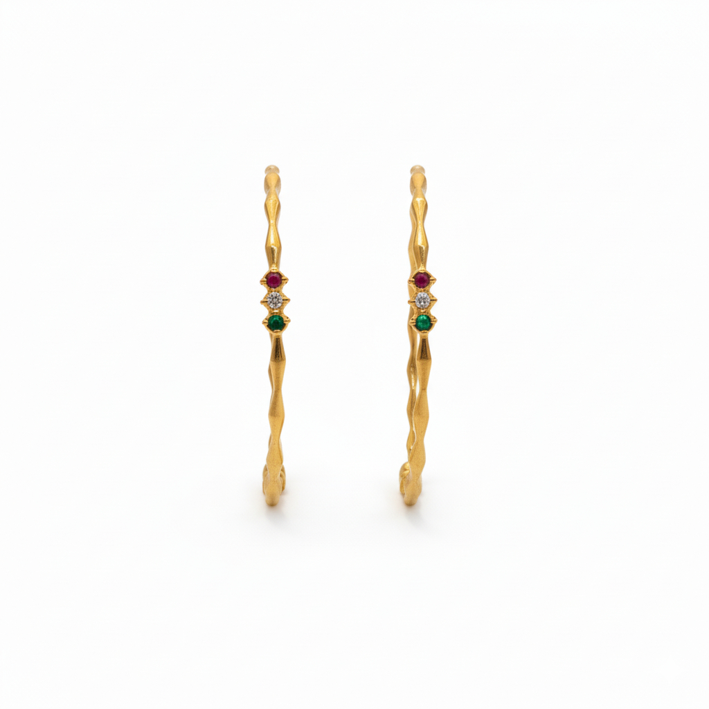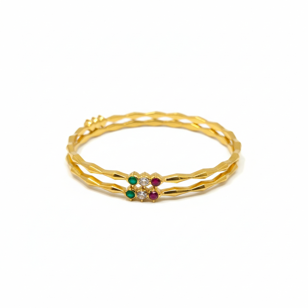 Grace your wrists with these elegant gold bangles featuring vibrant multi color stones set in a sleek, textured design. The balanced blend of red, green, and white stones adds a festive yet timeless charm. Perfect for traditional occasions or everyday elegance, they shine with refined beauty