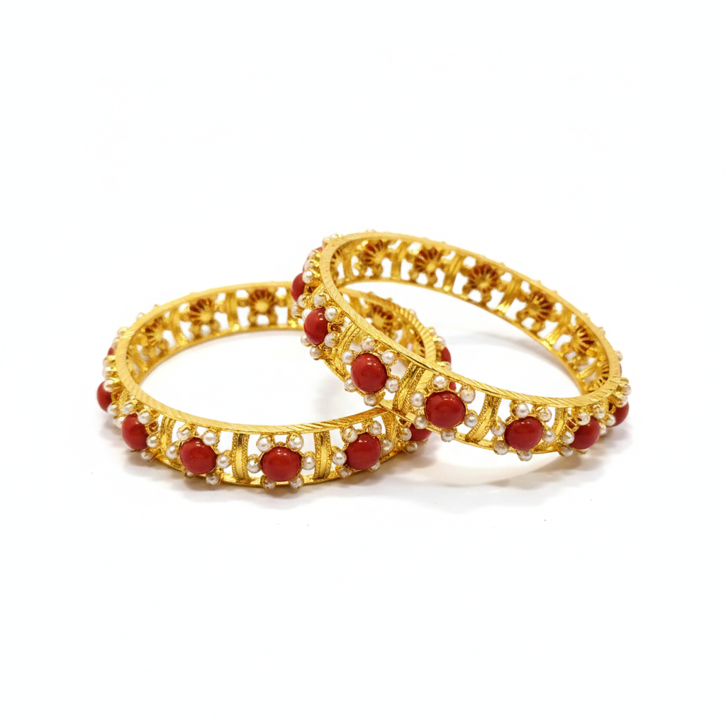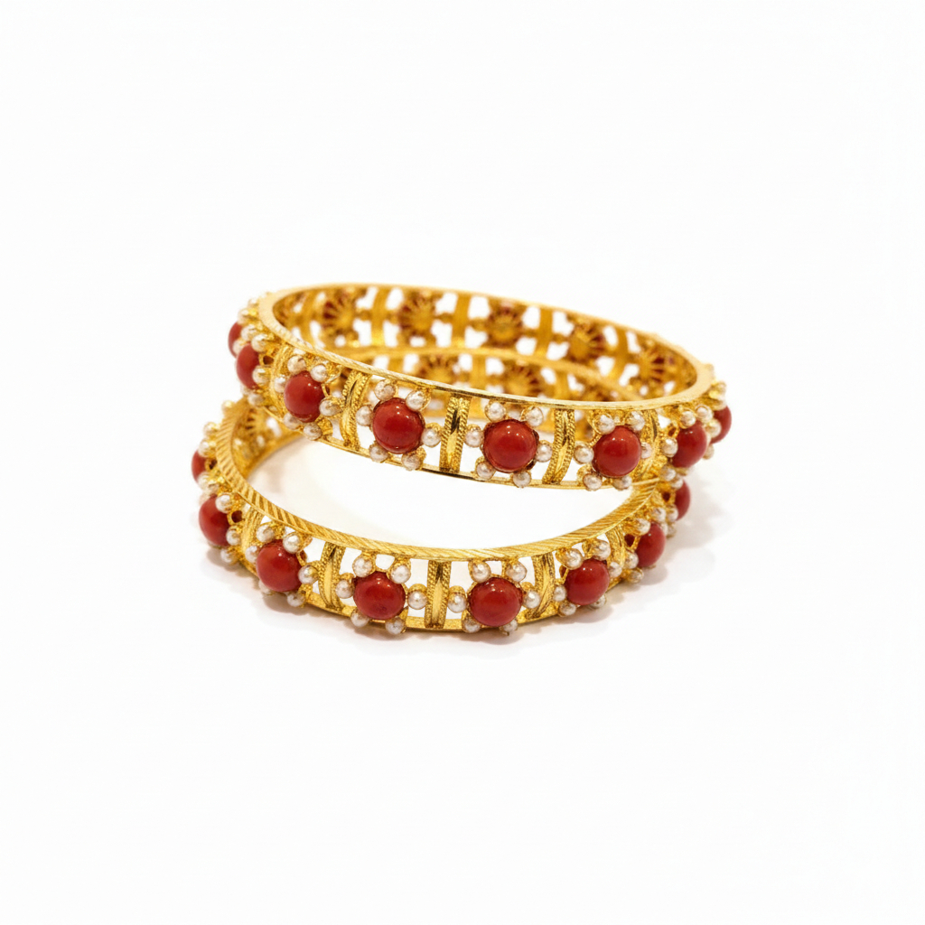 A classic pair of gold bangles adorned with rich red stone accents set in a rhythmic pattern. Designed with traditional elegance and timeless appeal, these bangles add a bold yet graceful touch to festive, bridal, and ceremonial ensembles.