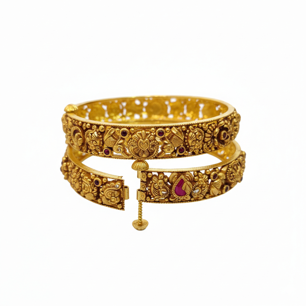An opulent antique-finish gold kada adorned with intricate traditional motifs and subtle crimson accents. Crafted for timeless elegance, its adjustable screw design blends heritage artistry with modern comfort—perfect for festive wear and statement styling