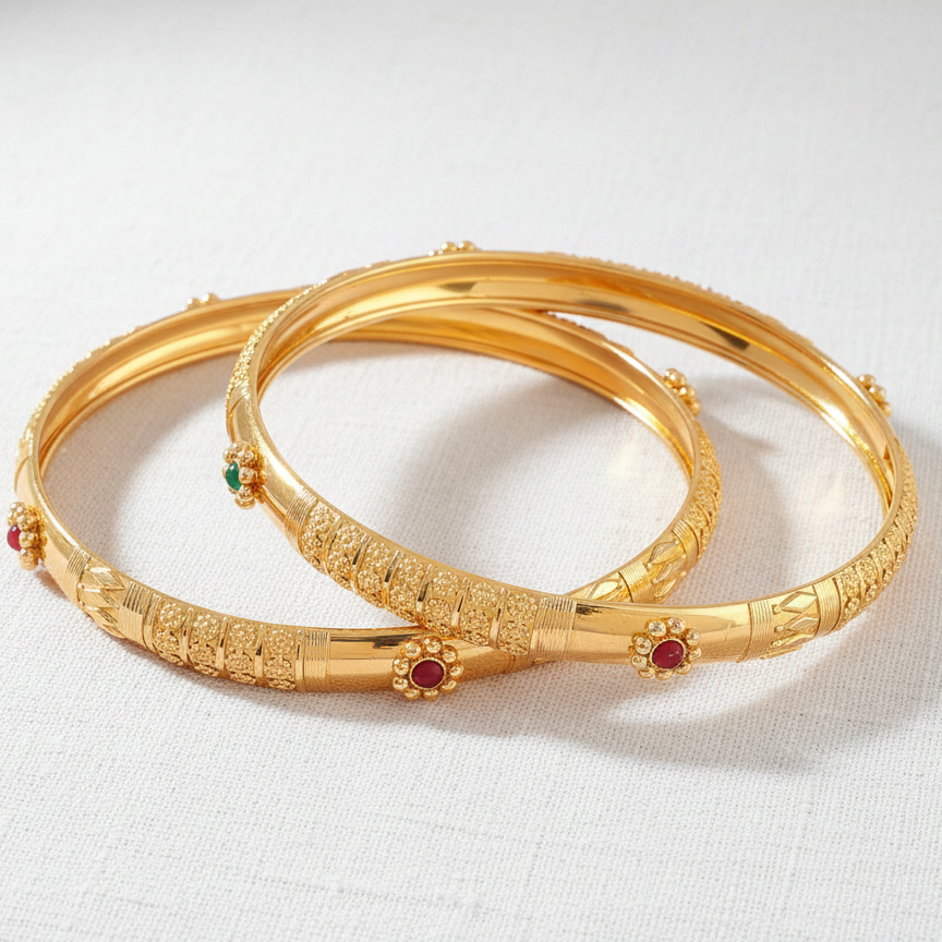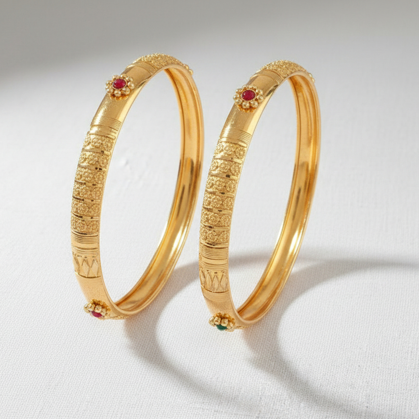 Classic gold-tone bangles adorned with fine engraved patterns and delicate colored stone accents. Designed with a slim, elegant profile, these bangles offer timeless charm and effortless grace, making them perfect for daily wear as well as festive occasions.